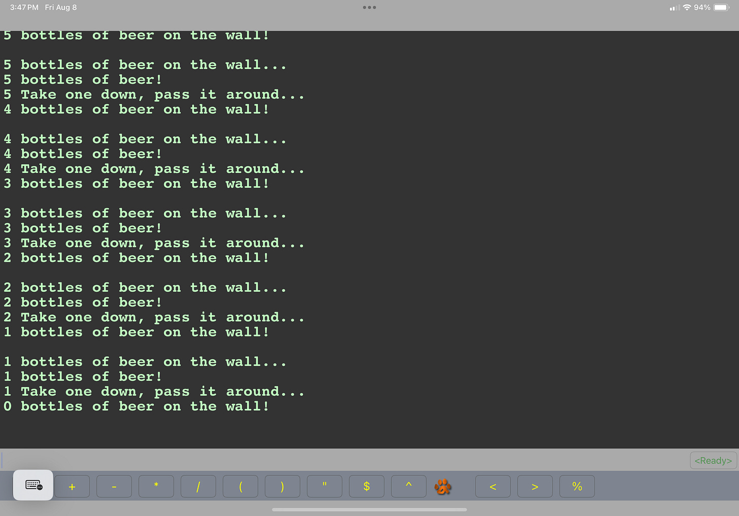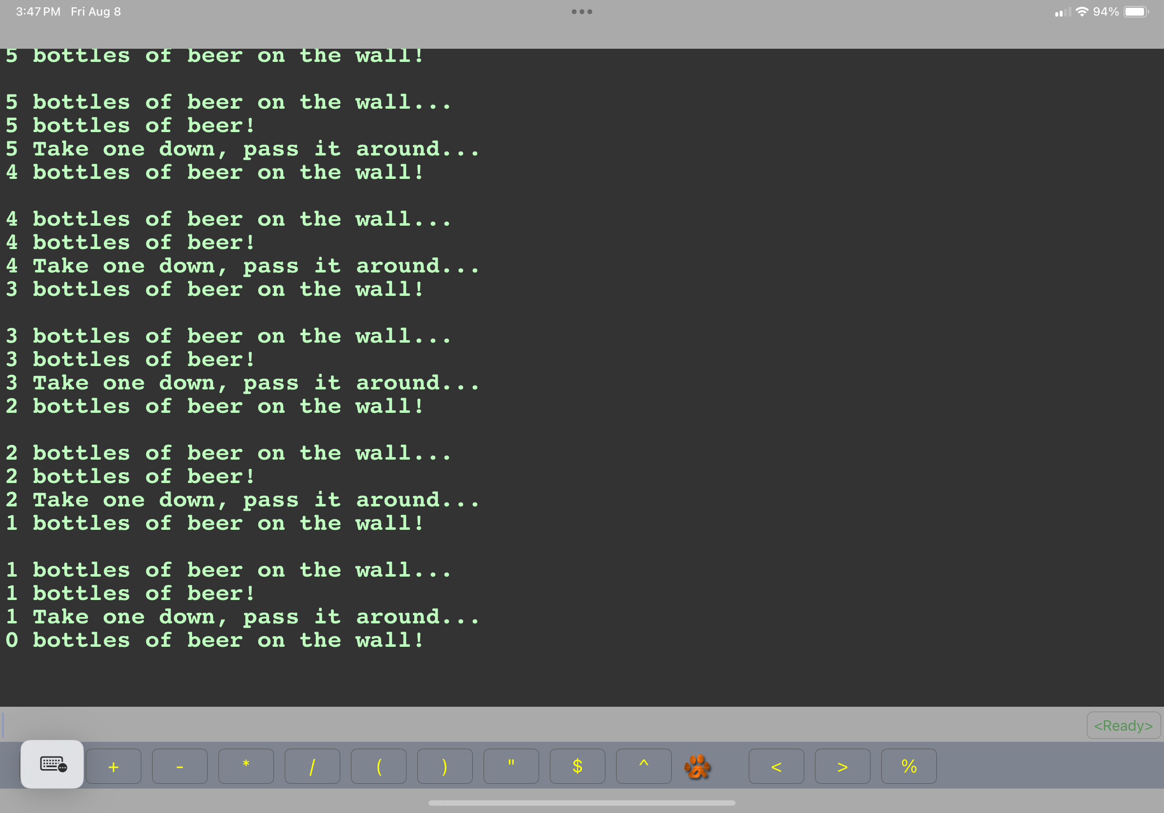 Just to prove that I still have incredible BASIC programming skills at this time, I found a decent version of BASIC that would run on my iPad and iPhone, loaded it, then cranked out this important and very useful program: