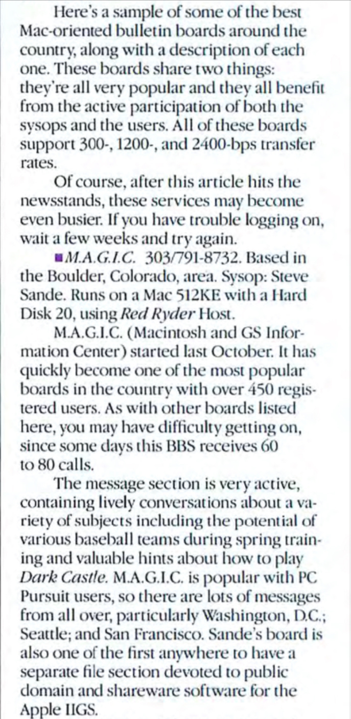 My third use case for BBSs was as a hobby. By the time early 1985 rolled around I was the proud owner of a Mac 512K computer, and I knew that I would have to be a frequent user of the local Mac boards. However, I didn’t like most of them for one reason or another. My brilliant solution in September of 1986 was to start my own Mac BBS called MAGIC (Mac And GS Information Center).