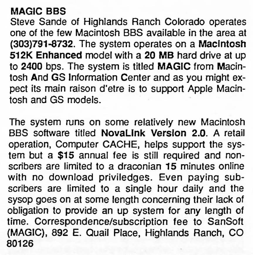Woo-hooo! Even though they got the location wrong (Highlands Ranch is nowhere near Boulder), the number of users increased significantly, and I decided to add a second Mac (part-time), modem, and phone line to MAGIC (at one point I would have four dial-in lines running on two Macs). All of that had a cost, of course, so I decided to see if I could start charging for a higher level of access.