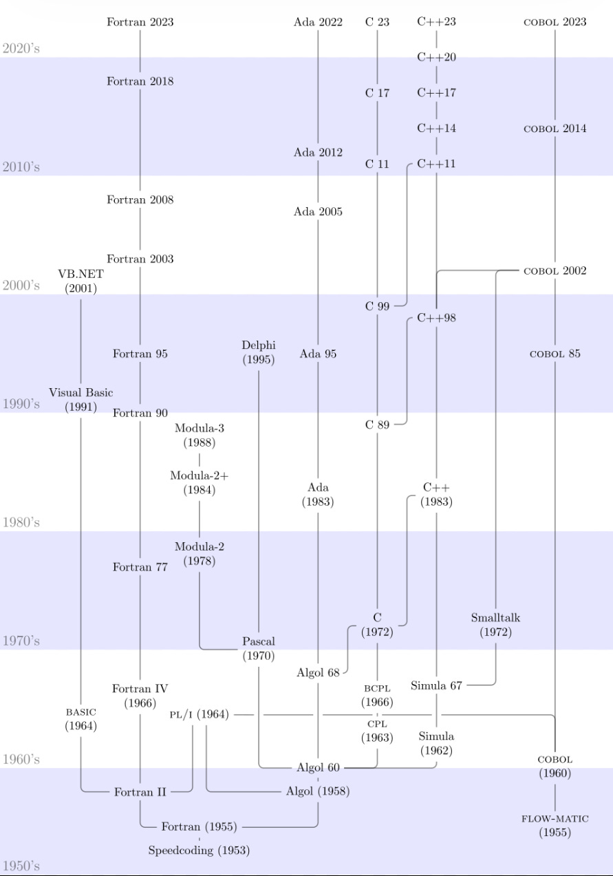 A timeline and family tree of the Algol, Fortran, and COBOL programming language families. Skippppp, Shazz, Borkowsk, Qwertyus, MáneyMánadóttir, CC BY-SA 4.0, via Wikimedia Commons