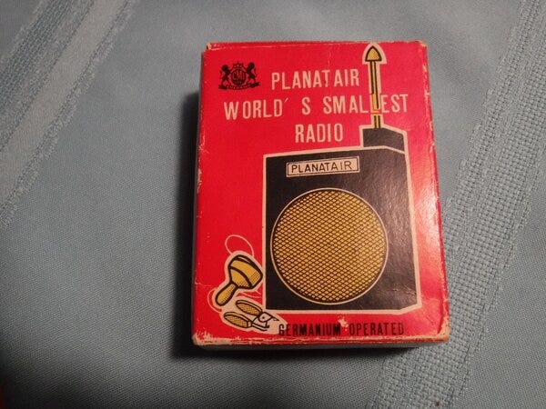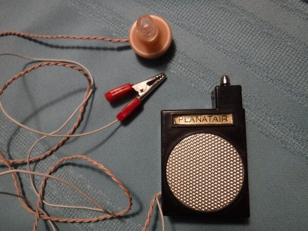 What I didn’t realize when I got the radio home and finally looked at it carefully was that it wasn’t a transistor radio. In fact, it didn’t even come with a 9-volt battery or need one. After looking at the rather confusing instructions, I figured out that you hooked it up to something metal using a wire with an alligator clip on one end, plugged the hearing-aid type earphone into your ear, and then moved a little rod in or out to tune in an AM station. It was called a crystal radio… more about that later.